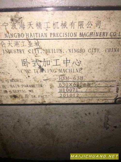 2010年海天卧式加工中心HTM-63H, 630X630mm,好货在位出售!要的抓紧联系~!类型:卧式加工中心品牌:HISION型号:HTM-63H主电机功率:22(kw)kw三轴行程(X*Y*Z):1000*850*750工作台面积为630×630mm;主轴转速可达5000rpm,快速达20m/min。